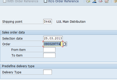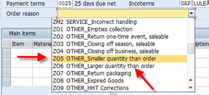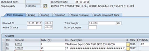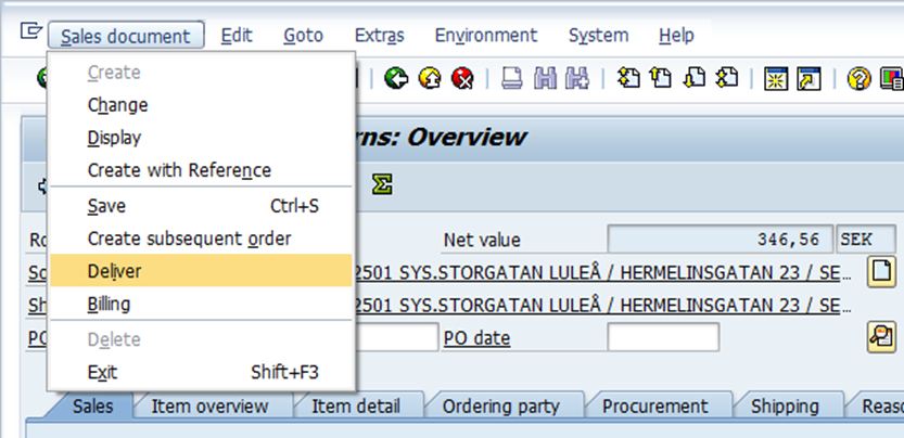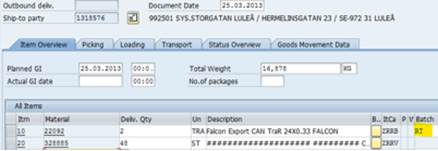 Ta upp ordern i VA05 à skapa ZORS i VA01 à kopiera över Sold To/ship TO/PO number, ändra datum till samma som ursprungsordern så priserna stämmer --> Items overview --> CTRL+Y, markera ”material” samt order ”quantity” à kopiera över alla rader ner till de nollade (ibockade) raderna, OBS! missa inte pallarna som ska vara sista raden à ändra plant på samtliga rader till rätt depå à var uppmärksam och kopiera även över radreferenserna på varje rad (Kolumnerna ”PO Item”+”Customer material number”)à sales document à deliver à RT i alla vita kolumner under BATCH à Post Goos Issue (PGI) à Felmeddelande (Förmodligen inget saldo på terminal) --> Kontakta Avräkningen och se hur de vill att du ska göra (Mot D001 och de flyttar saldo eller att du justerar upp så du kan justera mot depå)