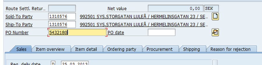 Sedan lägger du in det PO-nummer du vill göra din order mot. Här är det EXTREMT viktigt att man inte glömmer detta eller lägger in fel PO-nummer.  Lägg även in PO-date dvs. det datumet som leveransen var