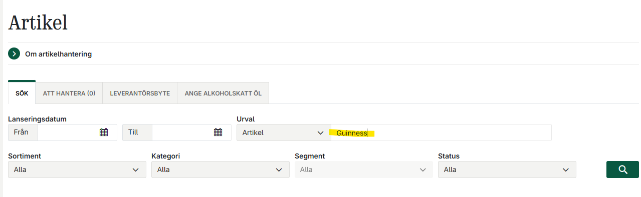 4. Skriv in namnet på den artikel du vill brista, som exempel tar vi Guinness Orig CAN 22139, då skriver vi Guinness & tryck enter: