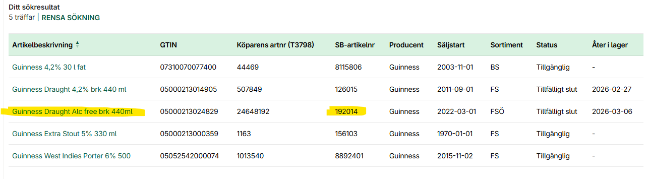 5. Välj sen vilken Guinness du ska brista genom att klicka på den, (dubbelkolla så att artikelnummer stämmer överens så du inte valt fel):