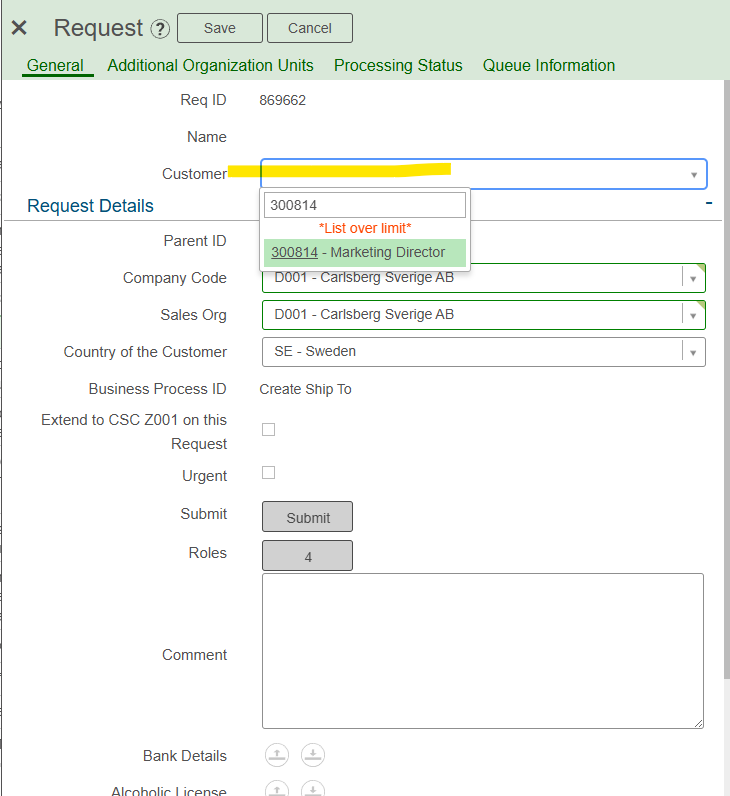 Skriv därefter en * under Comments och tryck på Save sen Submit (på samma sätt som när vi ändrar kontakuppgifter på en kund).