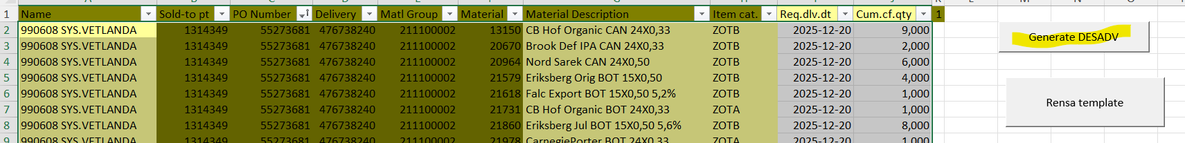 Fil som ligger under (N) -> Shared -> Systembolaget -> levavisering -> levavisering1 (excel) -> rensa template-> flik ECC input -> Markera allt! (från rad 2) -> delete -> Högerklicka i transaktion à spreadsheet -> format XXL -> table -> OK -> hoppar upp i Excel -> markera allt (från rad 2) -> kopiera -> in i ”template Excel” -> Generate Des -> kopiera ordernr till tomgodsraderna -> se att artikelnummer är korrekt, addera annars uppgifter i fliken CONVERSION -> exp till PDF -> läggs i mappen leveransavisering+ -> maila till butik -> Spara inte i filen (om inte artikelnummer är uppdaterat)