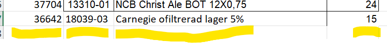 - Här ska SB artikelnummer ligga, står det istället vår artikelnamn saknas artikelnummer i filen och det behöver läggas upp i fliken "CONVERSION". Man kan även skriva in SB artikelnummer manuellt, artikellista SB hittar du här: Artikellista Systembolaget uppdaterad v 33- 2024 NY version.xlsx