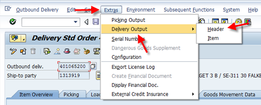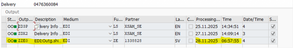 Sök på deliverynumret I VL02N(alt VL03N), klicka sedan på "Extras" -> Delivery output -> Header (Det ska vara 3 gröna prickar, är det 2 gröna har kund inte fått sin avisering, maila då planeringen och fråga vad som är fel och om dem kan köra igenom aviseringarna manuellt)