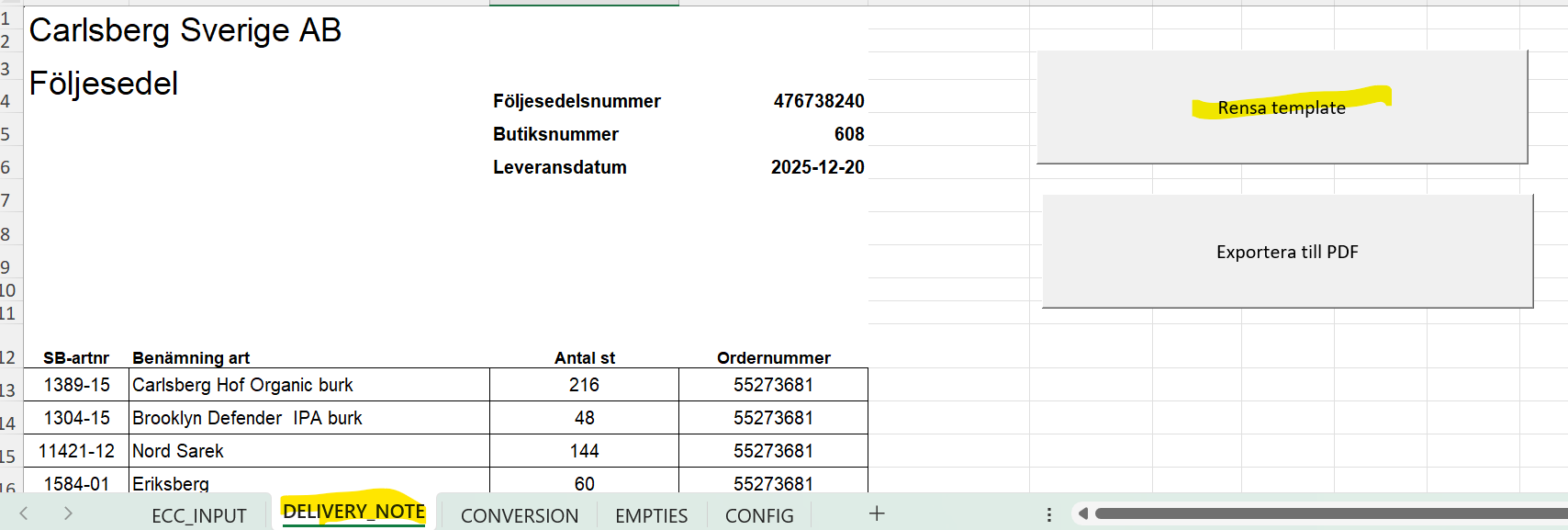 Då kommer du automatiskt tillbaka till fliken "DELIVERY_NOTE" och här ligger då alla artiklar och antal.