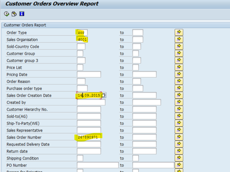 - Gå sedan in i transaktion zsd_customers_ord och fyll i enligt nedan: Order type, sales organisation, Sales order creation date (doc.date/pricing date) och Sales order number: