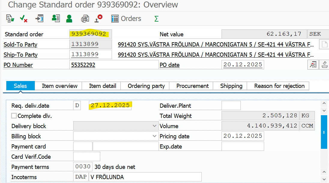 VA05 och kolla ordernr -> ZSD_customers_ord à ordertyp (zor) -> Org (D001) -> sales order creation (När är ordern skapad - 2-3 dgr före lev) -> Sales order number (vårt ordernr) -> välj detail -> output … (Lena) -> F8