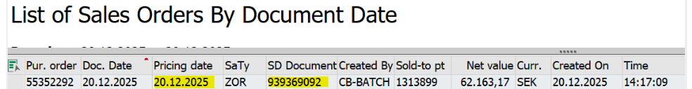 - Gå in i va05 (eller via WebUi) och kopiera ordernummer (vårt ordernummer) för dagens leverans - OBS! "Pricing date" i listvyn på Systembolaget är när ordern är lagd, 2-3 dagar innan leveransdatum. Man behöver gå in på ordern för att se leveransdatum, se nedan.