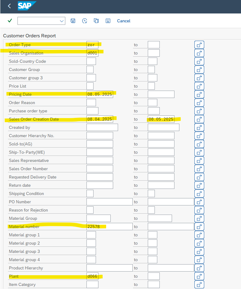 3. Fyll i gulmarkerat enligt nedan, Pricingdate är leveransdagen och under Sales Order Creation Date välj datum från en månad tillbaka. Fyll i artikelnummer under Material number samt vilken plant det omärkta kollit står på (exempelvis D066 för Göteborg). Tryck därefter på klockan.