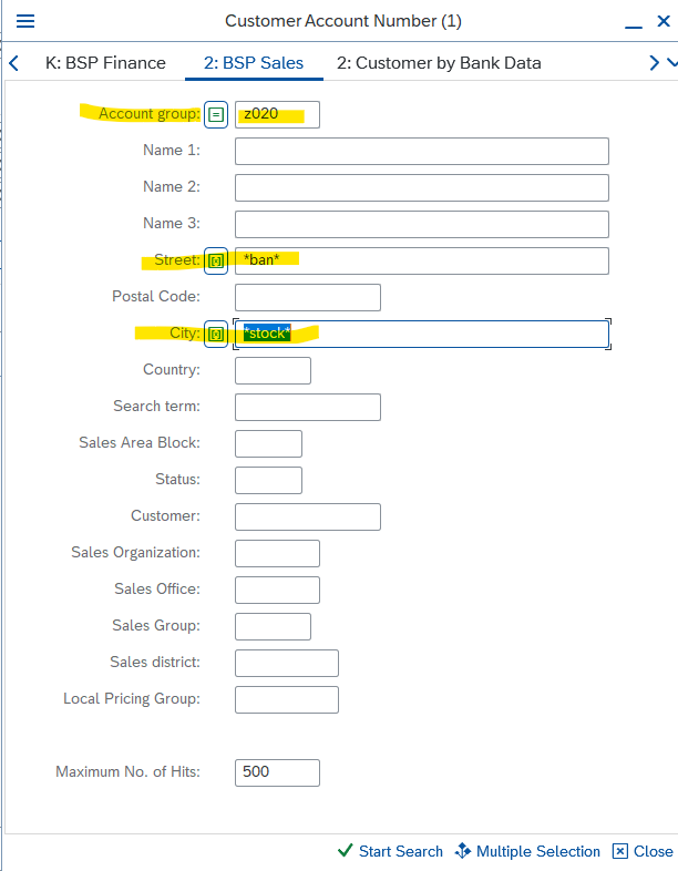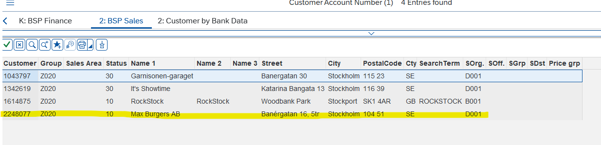 4. Under Account group skriv Z020, under Street skriv *gatuadress* och under City skriv *stad*. I nedan exempel där jag vill hitta shipto till Max Burgers, Banérgatan 16, 104 51 Stockholm så skriver jag såhär: