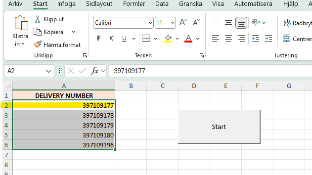 8. Ställ dig på rad nr 2, och kopiera in ordernummer genom att trycka på Ctrl+V: