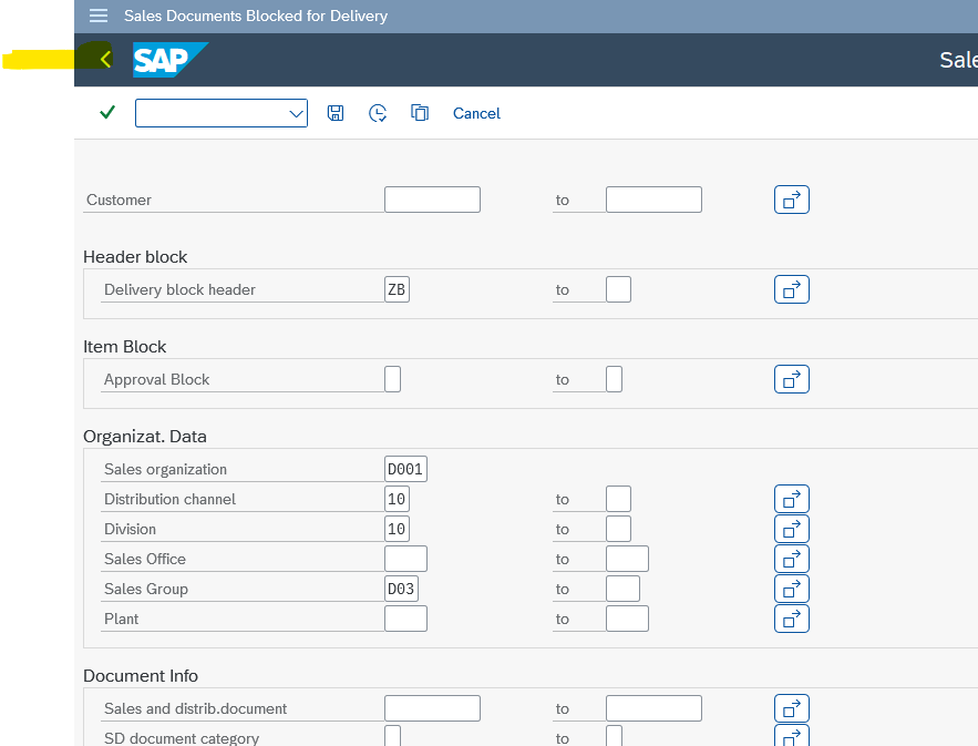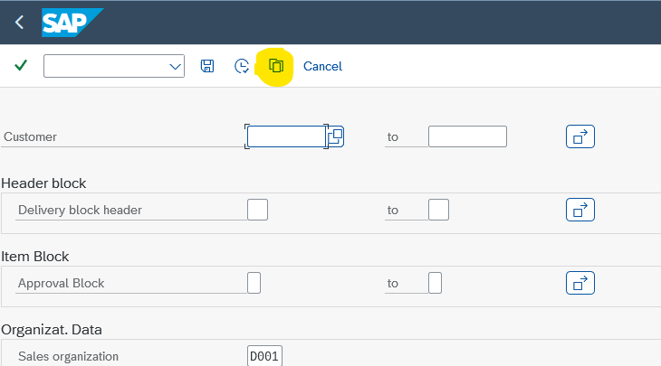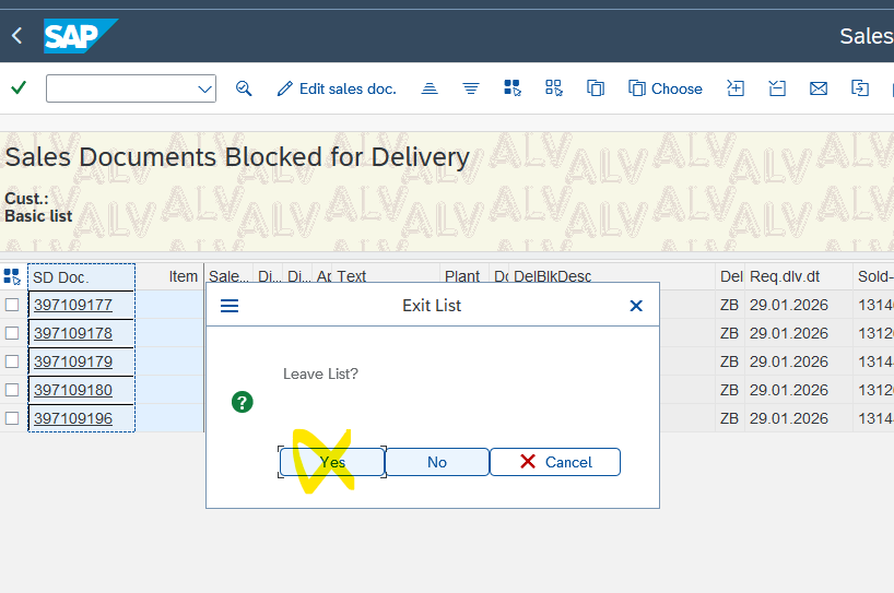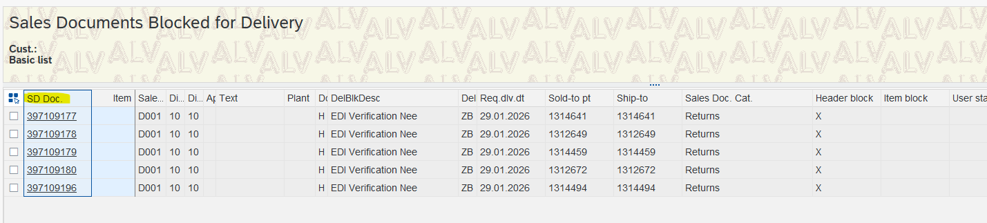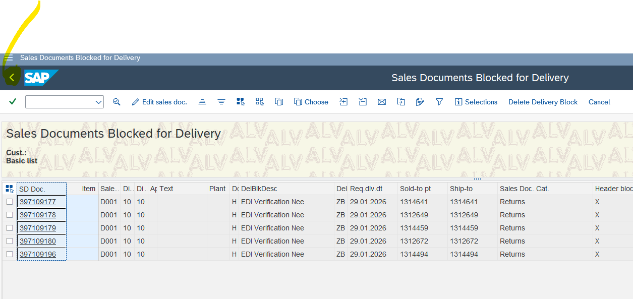 4. Skriv in ZB i kolumnen Delivery Block header, tryck därefter på klockan:
