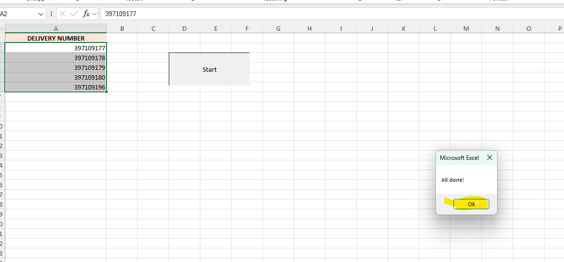 15. SAP kör igenom alla order automatiskt, när den är klar säger excelfilen till, tryck då på OK: