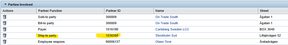 - Ändra till aktuellt Ship-to under Parties Involved (Ship-to finns i excelfilen). Klicka enter och säkerställ att adressen ändrats